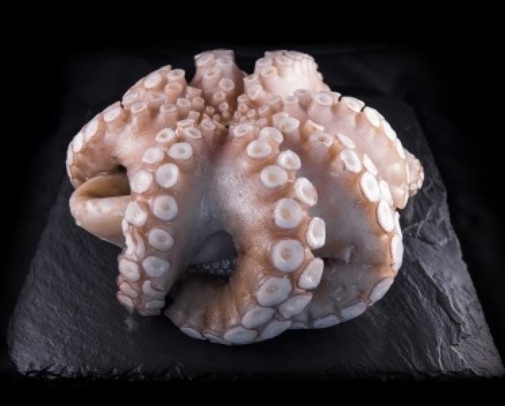 Poulpe (Octopus Vulgaris) entier nettoyé sans yeux ni bec battu congelé individuellement en fleur. Ce poulpe est péché dans les eaux sauvages et profondes du Mozambique dans le respect d'une pêche équitable (convention de Washington) et avec une surgélation immédiate à bord pour le bien-être animal.